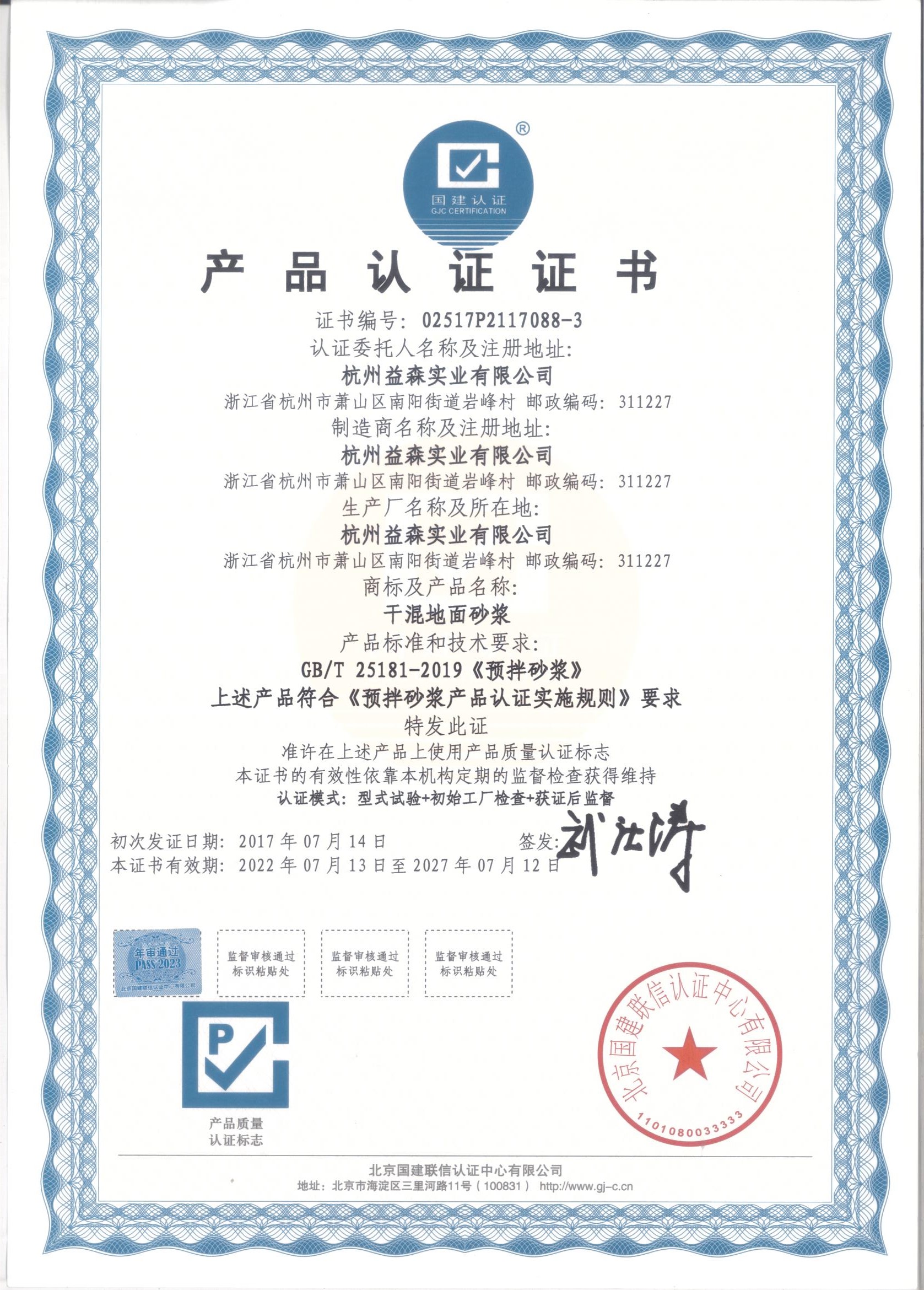 產(chǎn)品認證證書(干混抹灰砂漿)