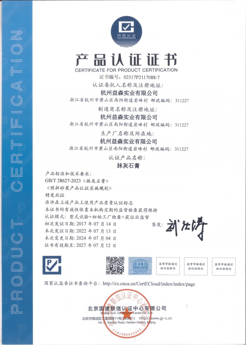 產品認證證書(干混陶瓷磚粘結砂漿)
