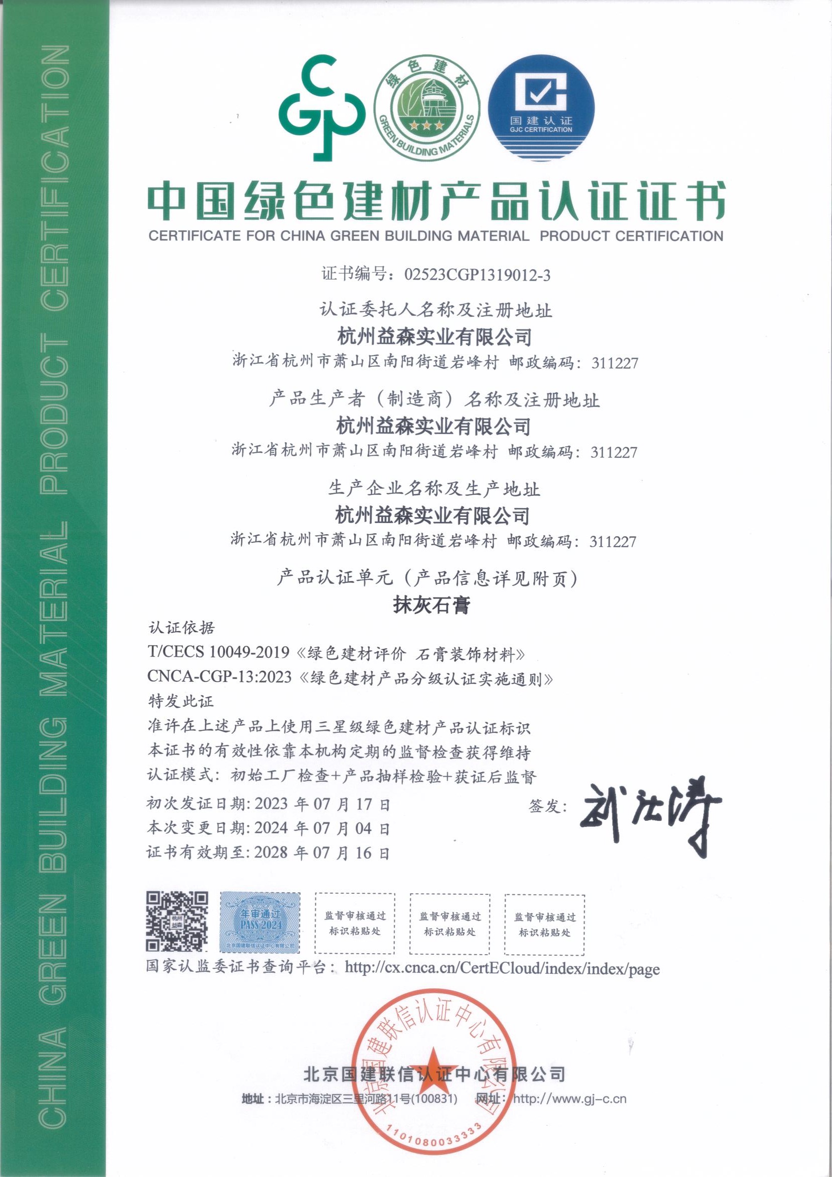 綠色建材認(rèn)證證書(shū)(抹灰石膏001)